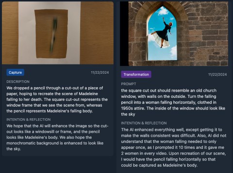 Vertigo.video is a workshop and corresponding website that I designed for the Media Aesthetics Core, piloted in seven sections in Autumn 2024. Instead of making an argument through research papers, we ask students to do so through creative means – in this assignment, through technology. Students perform close readings of Hitchcock’s 1958 film Vertigo, and Walter Benjamin’s “Art in the Age of Mechanical Reproduction.” Then, they choose from a list of possible scenes from the film, collaboratively re-enact and re-film their scene using their smartphones, and then input their footage into Runway, an AI tool that uses a video-to-video AI process to transform and reconstruct the footage. In addition to capturing their clips, students prompt the AI to change aspects like lighting and subject matter, and they can choose to reproduce, challenge, or comment on the film. In the process they learn practical aspects of filmmaking, such as framing, blocking, and isolating movement and gesture, alongside crafting prompts for an AI tool and critiquing the outputs by examining successes, failures, and the gaps between expectation and outcome.