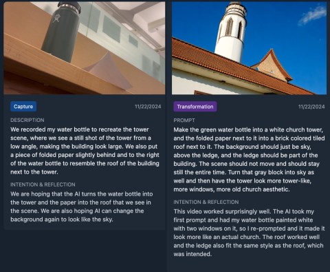 To see examples of students’ work, please see: https://vertigo.video/scene-8/. At the top of the page you’ll see Vertigo’s original dream sequence. Below that you can see students’ group submissions, both their recreations of the scene and their transformations of it, complete with the prompt they used for the AI when they transformed a scene.
